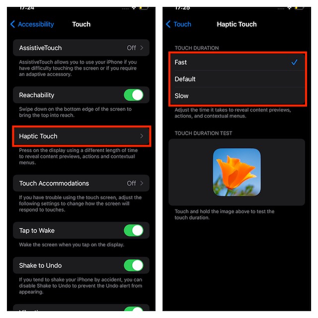 Appleは、古い「高速」設定の名前をiOS 16から「デフォルト」に変更し、新しいものを「高速」として追加しました。したがって、現在、選択できる3つのハプティックタッチ設定があります。