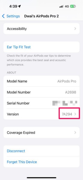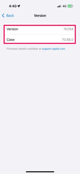 4。ユーザーもできますバージョンフィールドをタップしますを表示しますAirPodsケースのファームウェアバージョン。