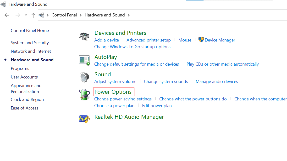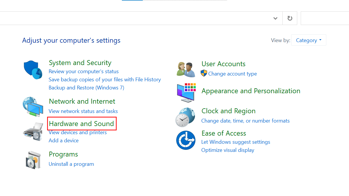 - 閉じますコマンドプロンプトそして開いていますコントロールパネル>クリックしますハードウェアとサウンド。