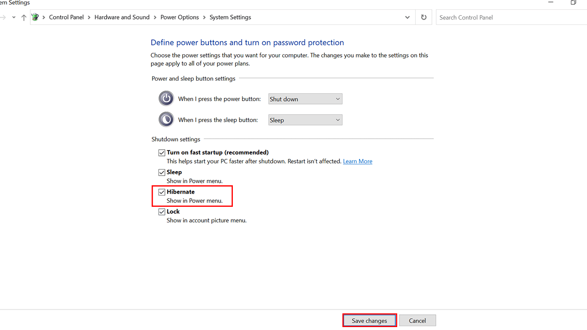 - 「下でシャットダウン設定」セクション、確認してください冬眠オプション>クリックします変更を保存しますボタン。