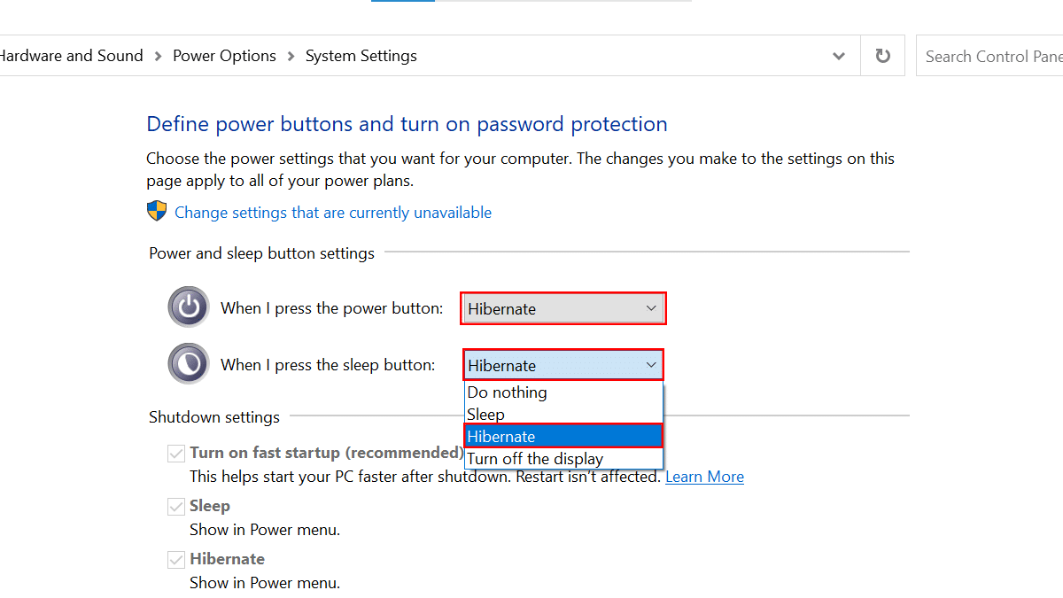 - 「」でHibernateオプションを選択します。スリープボタンを押すと」デスクトップPCをスリープ状態にするときに冬眠を許可する設定>変更を保存しますボタン。