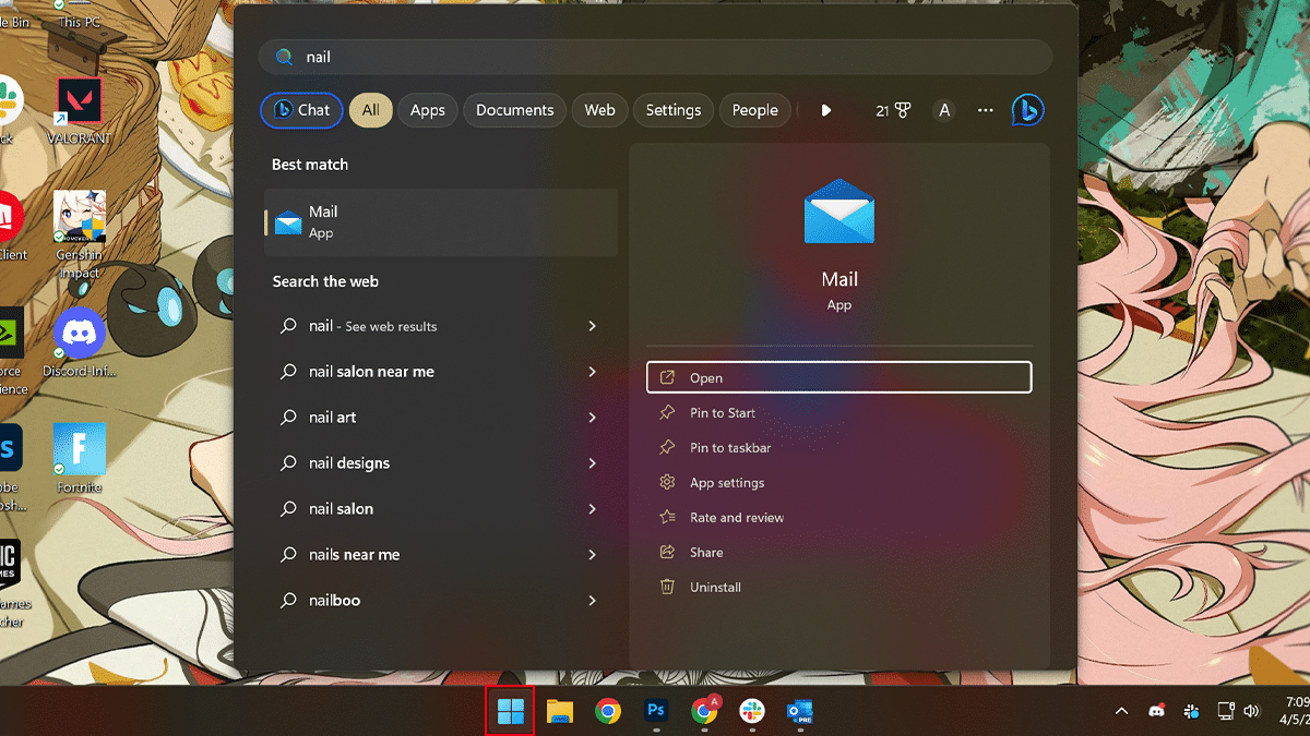 - 開ける始める>検索見通しまたは郵便app>をクリックします開けるボタン。