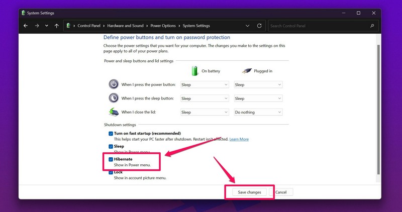 5。今、Hibernateオプションの横にあるチェックボックスをクリックしますそれを有効にし、下の[変更の保存]ボタンをクリックします。