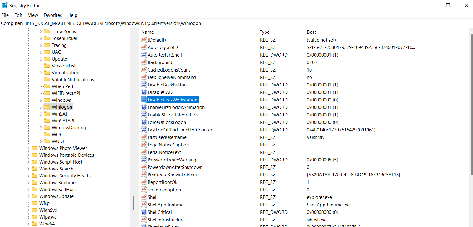 ステップ4:ここに値のリストが表示されます。探すDisableLockWorkStationリストで、このDWORDをダブルクリックして選択します。