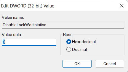ステップ5:開くダイアログボックスでは、値をに変更する必要があります0すべてのユーザーにロックコンピュータ機能を有効にする場合。値を入力します1機能を無効にしたい場合。