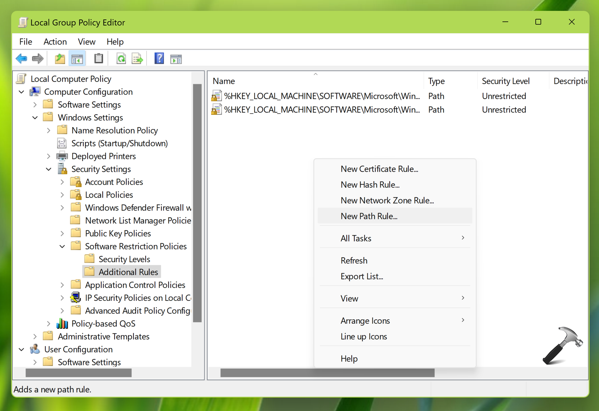 3。ソフトウェア制限ポリシーが定義されていない場合は、クリックしますアクション>新しいソフトウェア制限ポリシー。次に、ソフトウェア制限ポリシー>追加ルールに移動します。右ペインで、右クリックして新しいパスルールを選択します。パスとして入力しますC:WindowsSystemAppsMicrosoft.Windows.Search_cw5n1h2txyewy。 [適用]をクリックしてください、OK。