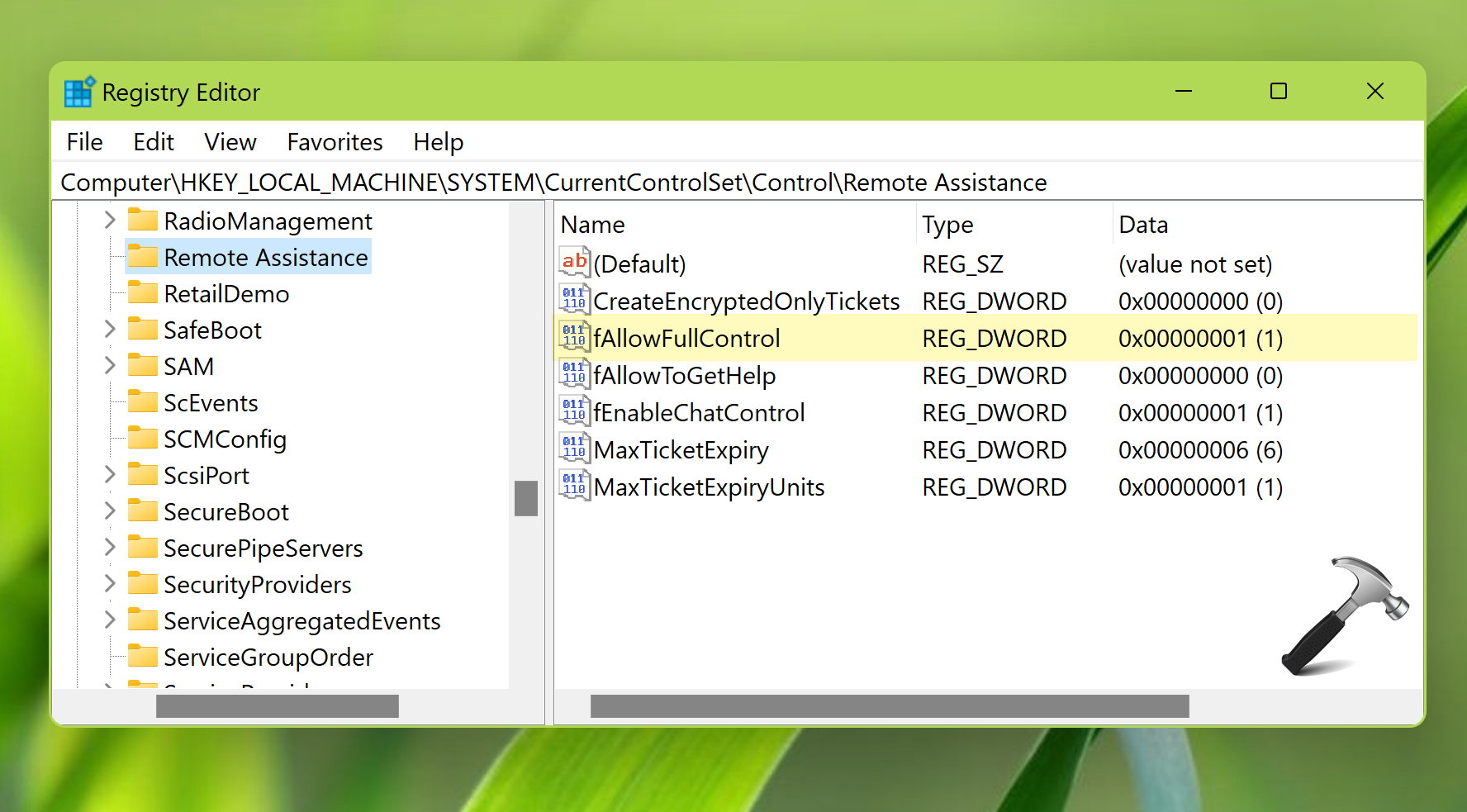 fAllowFullControlレジストリDWORD(reg_dword)。このDWORDを1つの値データに設定して、リモート支援を許可します。