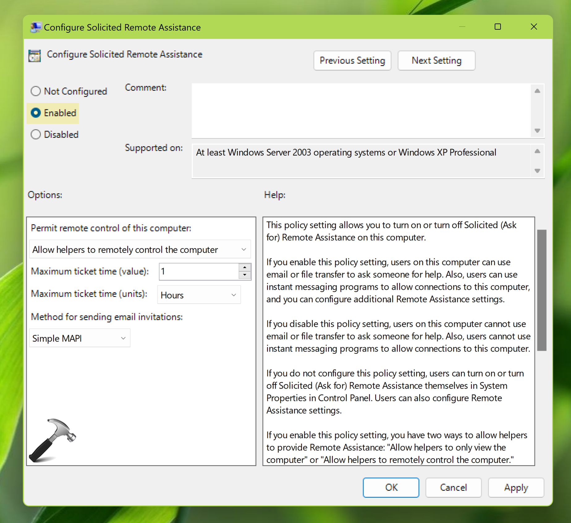 - [ポリシー構成]ウィンドウで、に送信します有効になっていますリモート支援を許可する。 [適用]に続いて[適用]をクリックします。