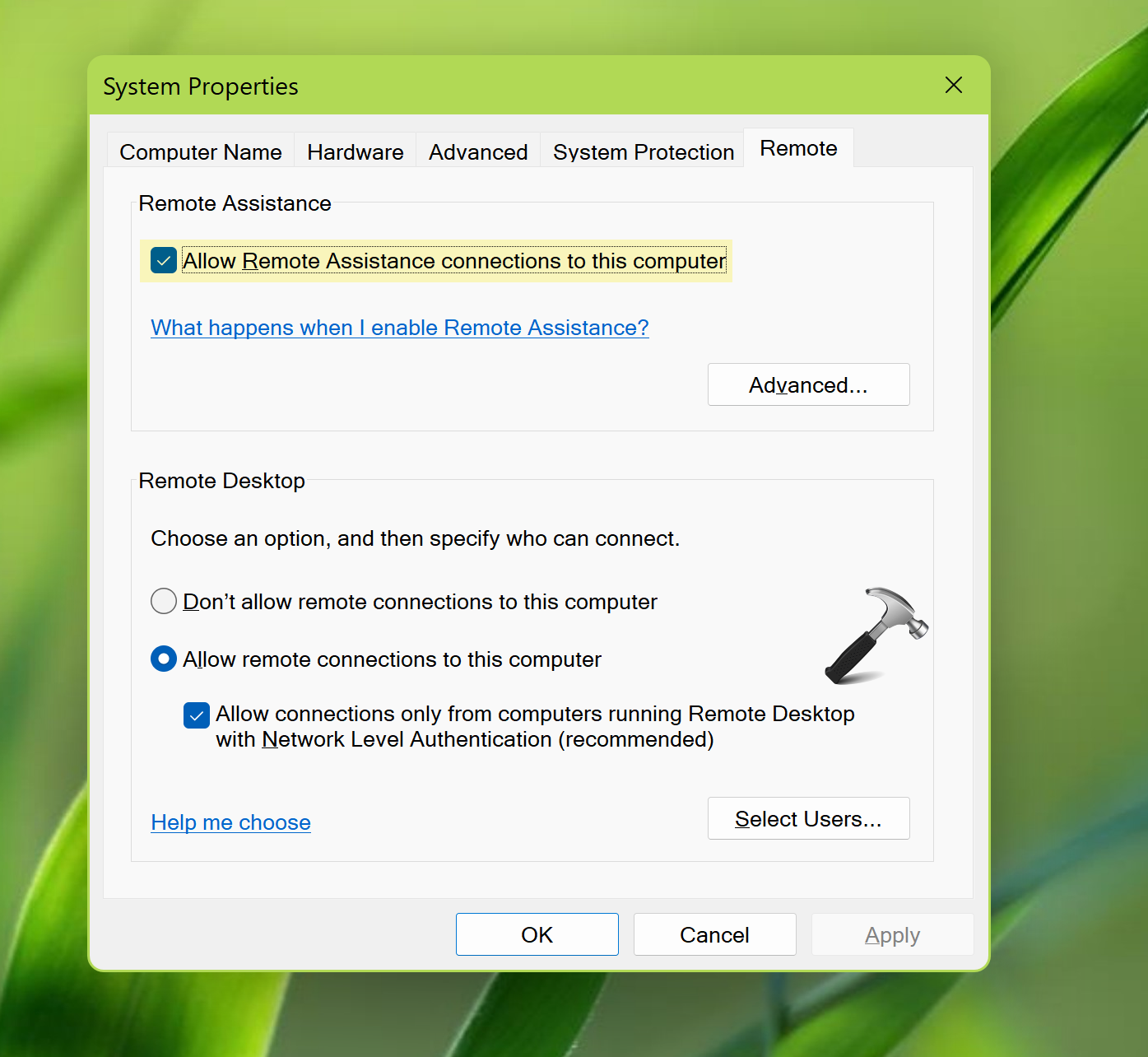 SystemPropertiesRemote.exe[OK]をクリックします。 - [システムプロパティ]ウィンドウで、を確認しますこのコンピューターへのリモート支援接続を許可しますオプション。