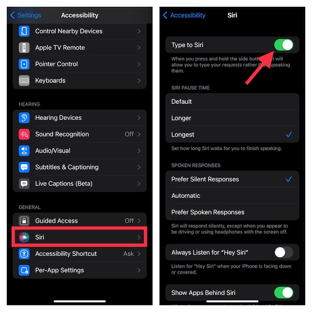 4。次に、トグルをオンにしますSiriにタイプします設定アプリを終了します。