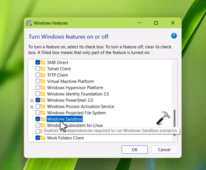 2。下にスクロールして、見つけますWindows Sandbox、そのオプションを選択し、[OK]をクリックします。