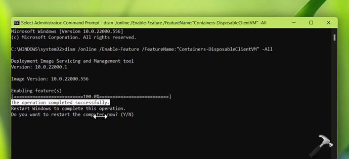 3。再起動を求めたら、Yキーを押します。システムが再起動し、Windows SandboxがNext Bootで有効になります。