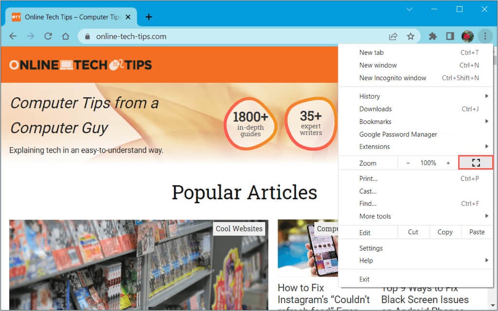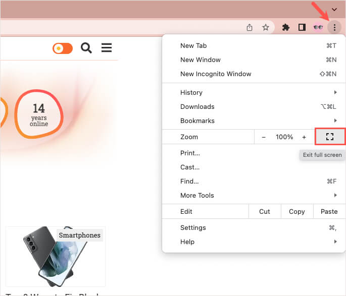 を選択します3つのドットクロムウィンドウの右上近くに、フルスクリーンモードを終了しますの隣のアイコンズーム。