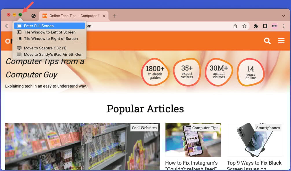 Macで、フル画面を入力しますボタン(斜めの矢印付きの緑)は左上にあります。ボタンを保持して選択することもできますフル画面を入力しますドロップダウンメニュー。