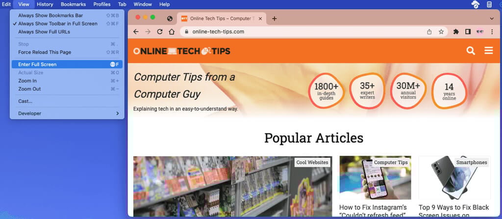 Macには、Chromeにフルスクリーンモードを入力する追加方法が1つあります。メニューバーに移動して選択しますビュー>フル画面を入力します。