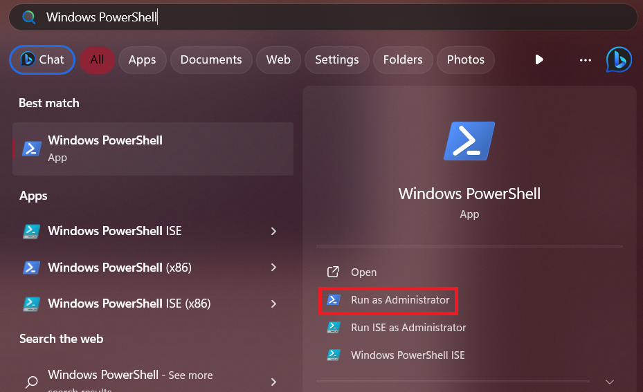 1。[スタート]メニューを開き、検索しますWindows Powershell、および選択します管理者として実行します。