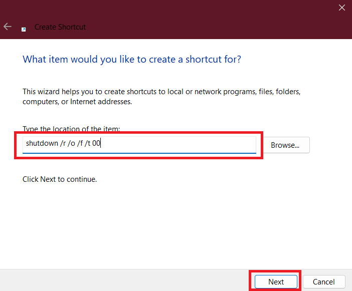 4。ショートカットの場所に次のアドレスを貼り付けて、次ボタン。