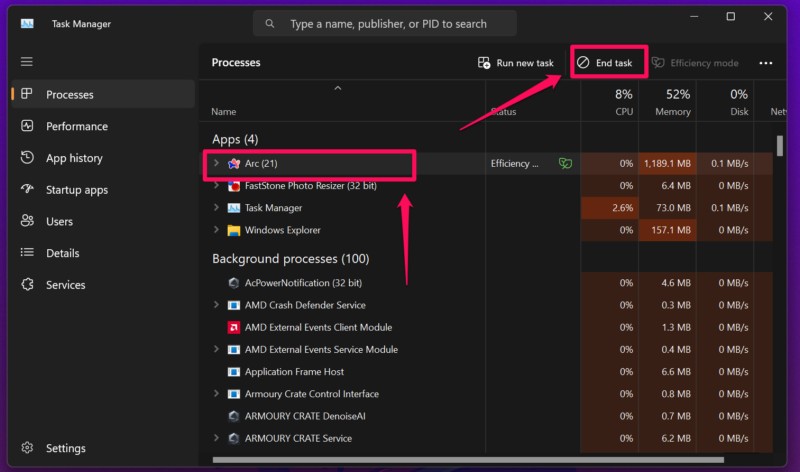 5。タスクマネージャーウィンドウ内で、反応しないアプリまたはゲームを見つけますそれは下のフル画面にありますプロセスセクション右ペインに。