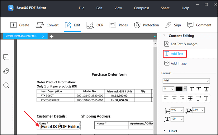 埋められないPDFフォームに記入する方法に関する次のソリューションは、EaseUS PDFエディターを使用します。ツールを使用して、テキストフィールド、ラジオボタン、チェックボックス、およびPDFフォームのその他の領域に指定したデータを入力できます。このソフトウェアを使用すると、フォームが入力できなくても、PDFファイルに直接テキストを追加できます。追加するテキストのフォントサイズと色を変更できます。ここにステップがあります: