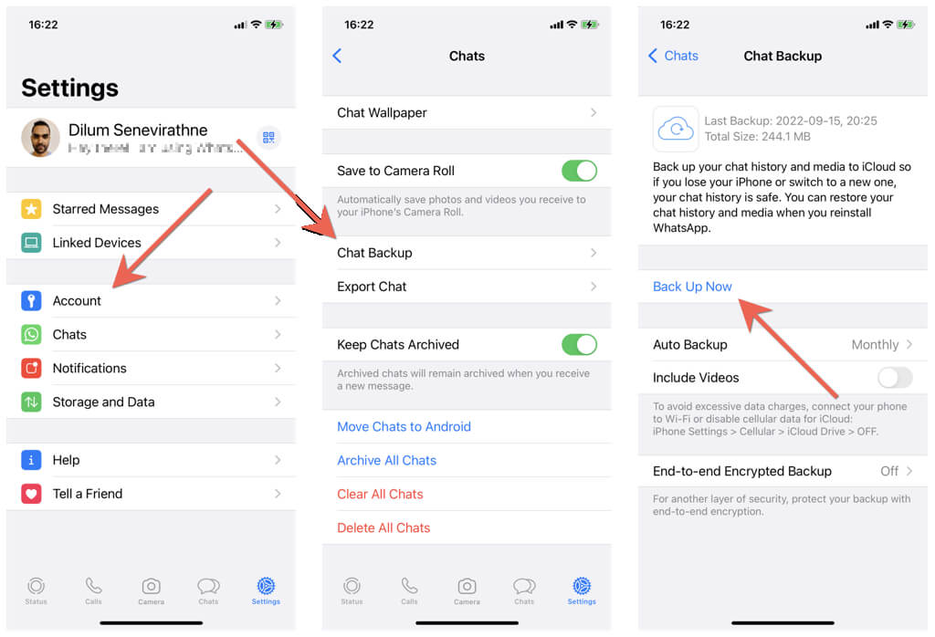 - 行きます設定>チャット>チャットバックアップタップします今すぐバックアップします情報をiCloud(iOS)またはGoogleドライブ(Android)にバックアップします。次のスイッチを必ず回してくださいビデオを含めますWhatsAppビデオの添付ファイルを新しい電話に転送する場合。