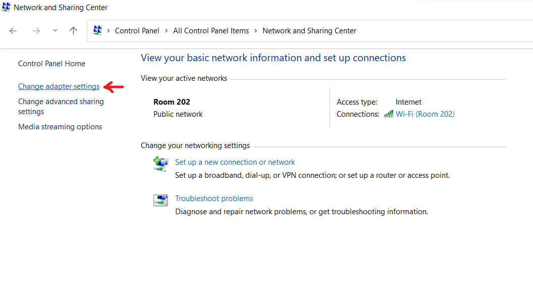 - 次に、クリックしてくださいアダプター設定を変更します画面の左側に。
