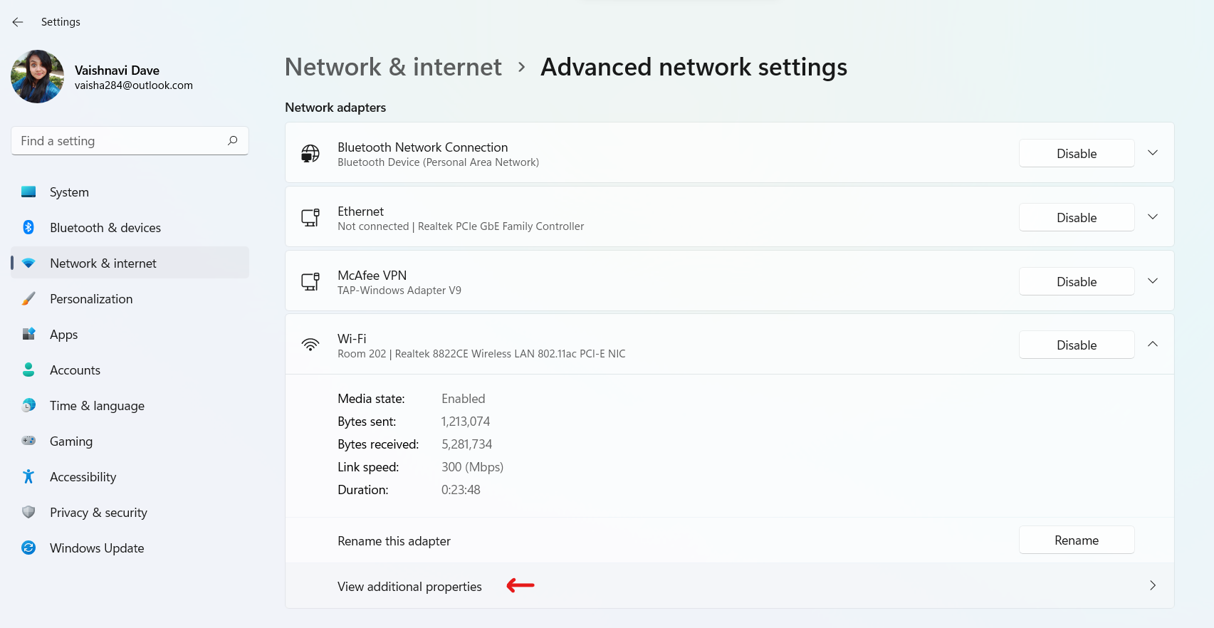 - ここで、ネットワークアダプターのリストから、詳細を知りたいものを選択します。展開したら、クリックしてください追加のプロパティを表示します。
