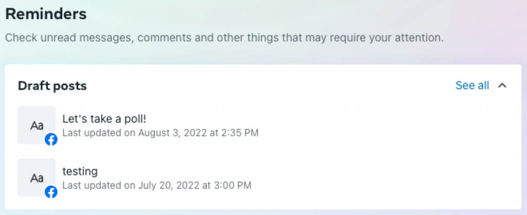 Facebookページのために保存するドラフトは、仕事をまったく異なる方法で管理しています。あなたが何人持っていても、あなたはあなたのすべてのドラフトを備えた中心的な場所を持っています。その後、保存したドラフトを公開、編集、または削除できます。