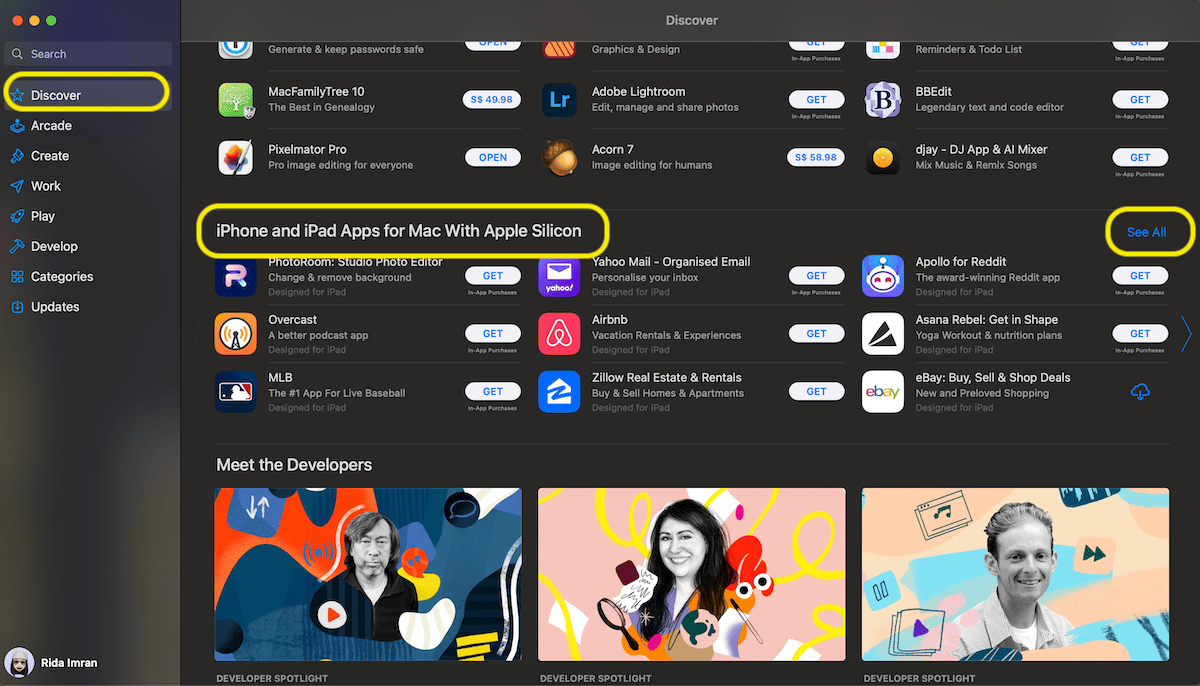 - メニューを下にスクロールし、「Apple Siliconを使用したMac用のiPhoneおよびiPadアプリ」の「すべてを参照」オプションをクリックします。