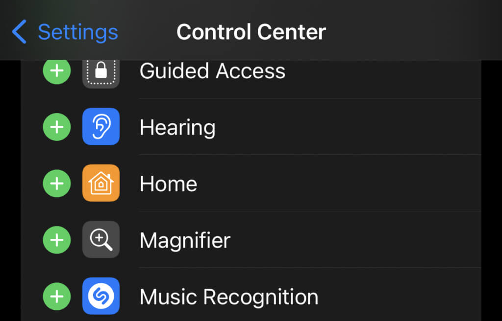 - 下にスクロールして、横にあるプラスアイコンをタップします音楽認識。