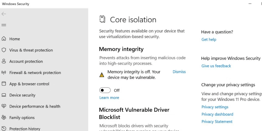メモリ整合性と呼ばれるセキュリティ機能は、仮想化を使用して、不要なプログラムが重要なセキュリティ手順を変更するのを止めます。ただし、このセキュリティオプションは、時代遅れまたは未登録のドライバーがコンピューターのロードと操作を停止する場合があります。