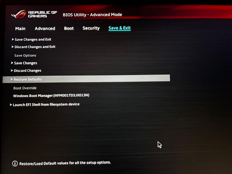 2。PCまたはラップトップモデルに応じて、場所を見つけますデフォルトを復元しますオプション。私のASUS ROGデバイスには、[保存]タブを終了しますでBIOS Advanced Mode。