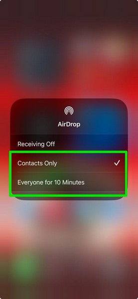 これらの変更に続いて、AirDrop Discoverabilityの設定を連絡先のみまたは全員に10分間設定し、iPhoneで機能を使用しようとします。