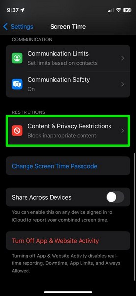 AirdropがiPhoneで機能していない別の珍しい理由は、デバイスの画面時間機能に関連している可能性があります。デバイスの画面時間のコンテンツとプライバシー制限の設定でAirdropが許可されていないかどうかを確認して、機能が適切に機能するのを防ぐことができます。
