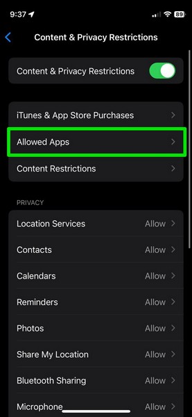 6。許可されたアプリページで、エアドロップのトグルが有効になっていることを確認してくださいデバイスで。そうでない場合、トグルをタップして、コンテンツとプライバシーの制限のエアドロップを許可します画面時間の設定。
