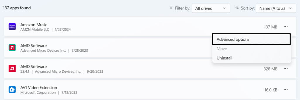 3。を選択します3つのドット(…)アプリの隣とメニューから、高度なオプションセクション。