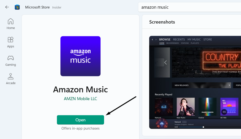 1。起動しますMicrosoft StoreアプリPCまたはラップトップで検索しますアマゾン音楽アプリ。