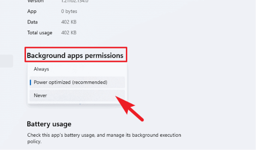 4。にスクロールしますバックグラウンドアプリの権限セクションとを選択します一度もないオプション メニューから。