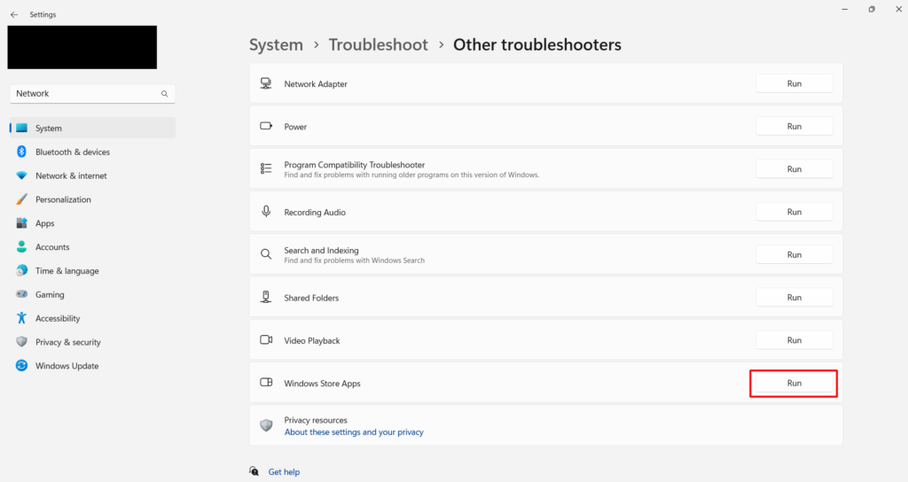 9.Microsoftストアアプリのトラブルシューティングを実行します