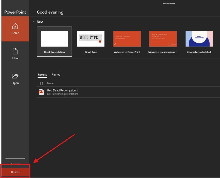 2。クリックしますオプションボタン左ナビゲーションバーの下部に。