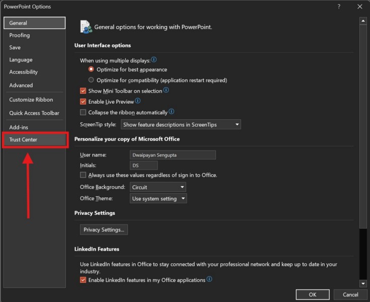 3。次のウィンドウ内で、クリックしますトラストセンターオプション左ペインに。
