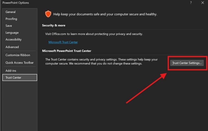 4。次に、クリックします信頼センター設定ボタン右ペインに。