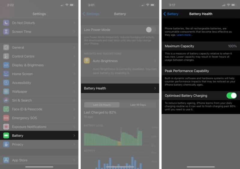 バッテリーの健康状態を確認するには、に進みます設定→バッテリー→バッテリーの健康。