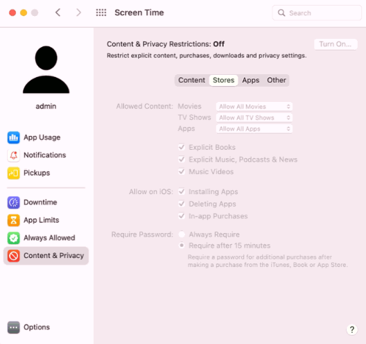 4。の左側から画面時間ウィンドウ、見つけてクリックしますコンテンツとプライバシー。