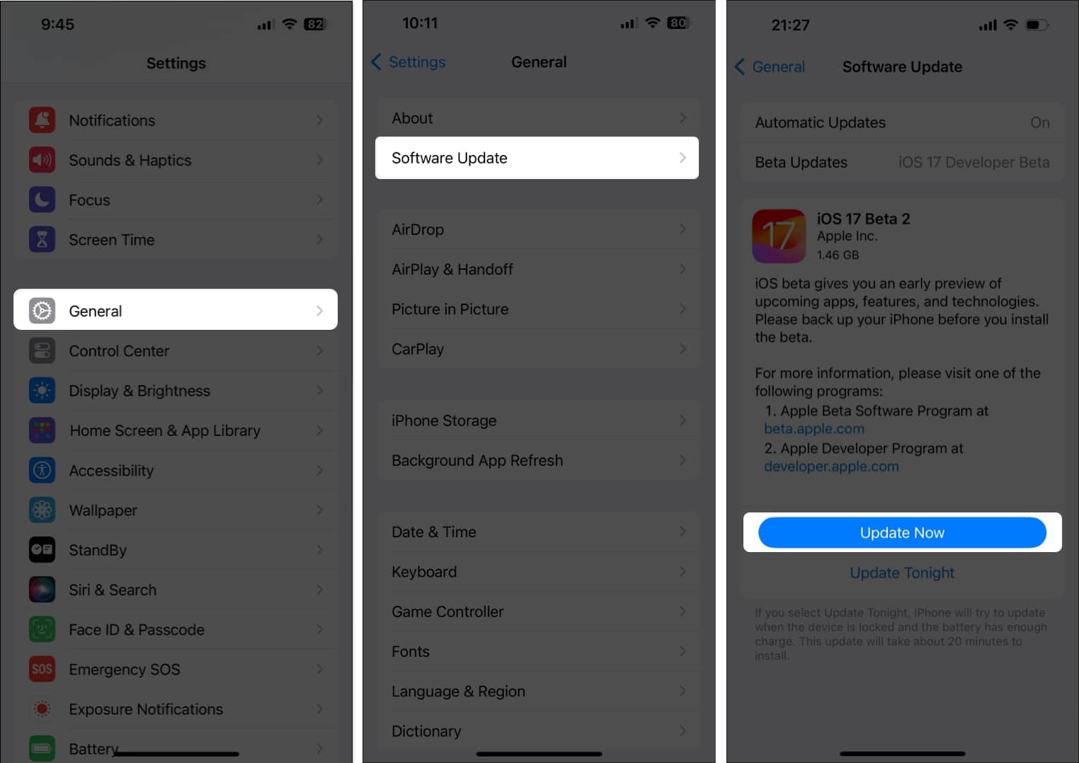 Apple Musicのアニメーションカバーアート機能は、iOS 17以上のみです。そのため、デバイスを最新のiOSに更新することが不可欠です。そうするために、に行きます設定→一般的な→ソフトウェアアップデート→タップ今すぐ更新してください更新が利用可能な場合。