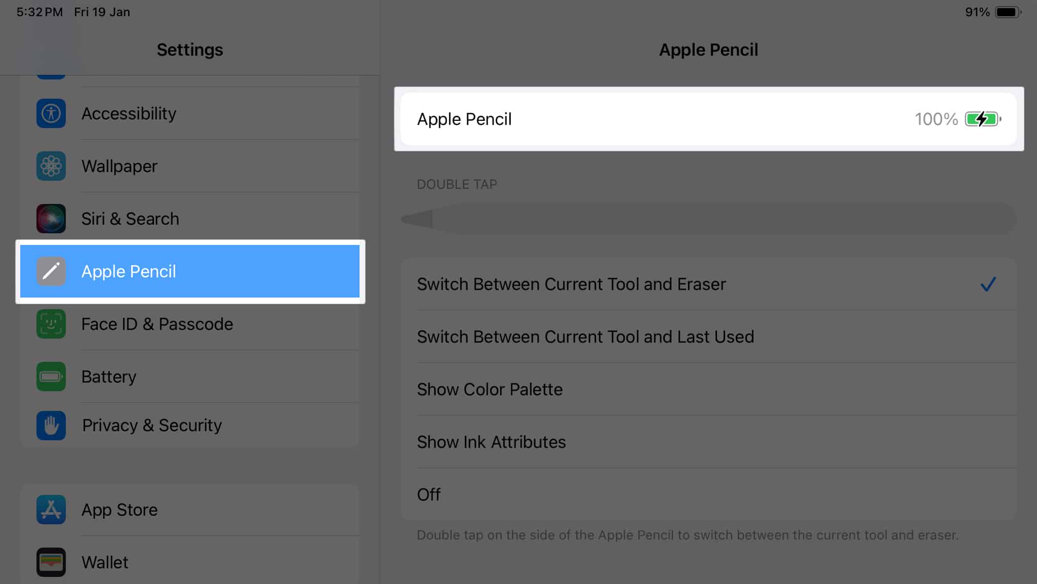 時には、鉛筆が接続されて充電されていても、上部に通知が表示されない場合があります。したがって、確認するには、に進みますiPad設定→見つけることができるかどうかを確認してくださいリンゴの鉛筆左ペインに。はいの場合、タップしますリンゴの鉛筆→右ペインの充電ステータスを探します。