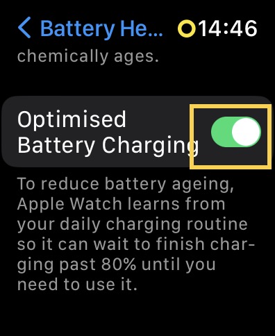 この機能をオフにすることはできますが、本当に必要な場合を除き、それを行うことはお勧めしません。私の経験では、私は常に時計の最適化されたバッテリー充電機能をオフにしており、1年未満の期間以内に、デバイスのバッテリーの健康が2%の影響を受けています。とはいえ、上記の上記は、Apple Watchで最適化されたバッテリー充電を無効またはオフにする手順です。