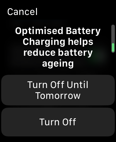 ここでは、最適化されたバッテリー充電を読み取る対話が促され、バッテリーの老化が減少します。 2つのオプションから選択できます。明日までオフにしますまたは消す完全に。それに応じて選択してください、それだけです!これで、Apple Watchで最適化されたバッテリー充電を正常に無効にしました。