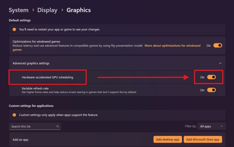 5。次に、確認してくださいトグルのためにHardware-Accelerated GPUスケジューリングオプションは有効になっていますか否か。有効になっていない場合、[トグル]をクリックして有効にしますすぐに。