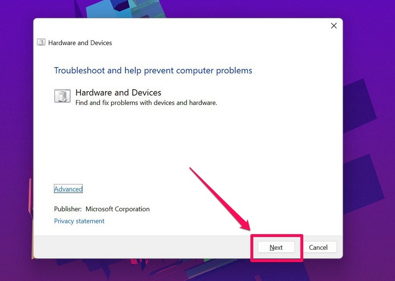 3。以下のハードウェアとデバイスのトラブルシューティングウィンドウで、[次のボタン続行する。