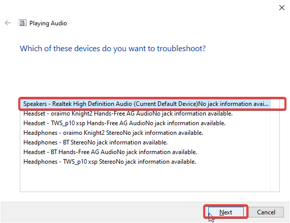 3。次のウィンドウを数秒待って、トラブルシューティングするオーディオデバイスを選択します。その後、クリックします次他のプロンプトに従って問題を修正します。